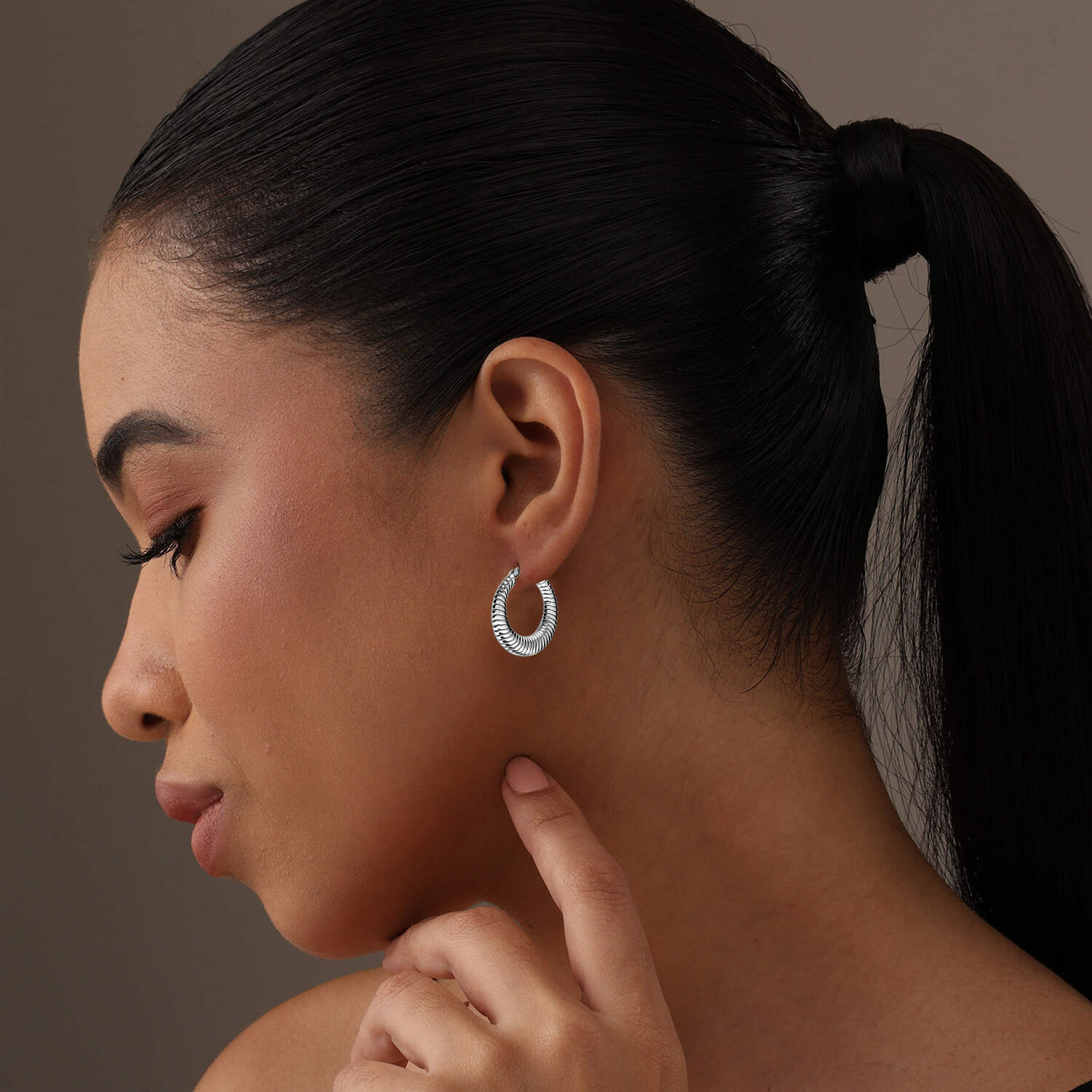 Bold sterling silver spiral hoop earrings shine during formal events. Stack with complementary silver jewelry, such as delicate chains, textured bangles, maybe one statement ring. The spiral motif becomes a cohesive design thread tying everything together. Hair swept back showcases the curves perfectly under evening lighting.